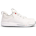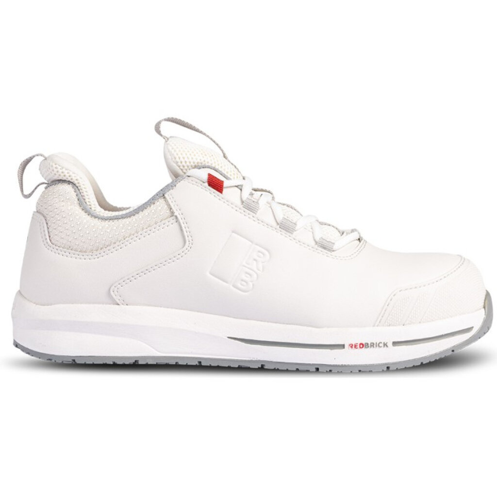 S3S ESD-norm lage veiligheidsschoen met gesloten hiel van Redbrick, de eerste Motion in het wit. Comfortabele schoen met microfiber bovenwerk, maar daaronder een stevige aluminium veiligheidsneus en antiperforatie tussenzool van Kevlar.